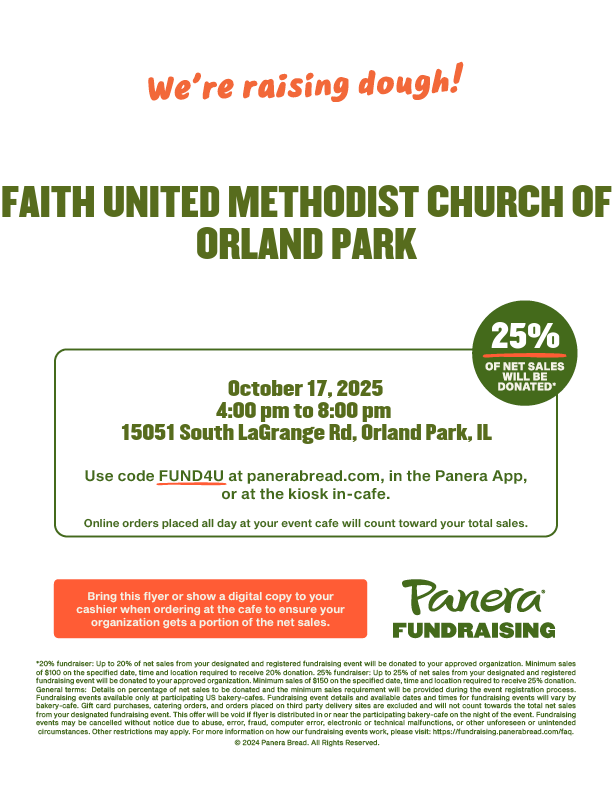 Faith will receive 25% of all sales when you show the insert available in your bulletin or the flyer below. Please enter FUND4U in the coupon code field at checkout if you are ordering online, in the MyPanera app, or at a kiosk in the store, or else your order will not count toward the fundraiser.