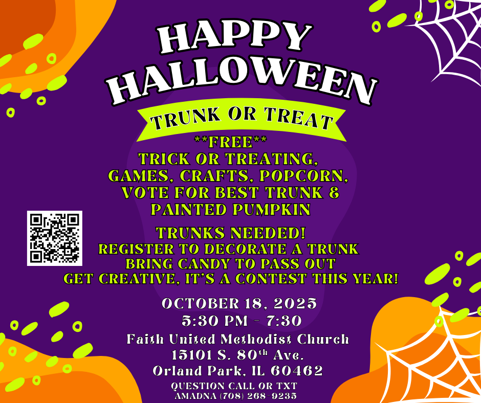 We are having our annual Trunk or Treat on Saturday, October 18th from 5:30 pm – 7:30 pm in Faith’s parking lot. Come in costume and trunk or treat. We will be having free popcorn, games, storytelling, and more. All ages are welcome.