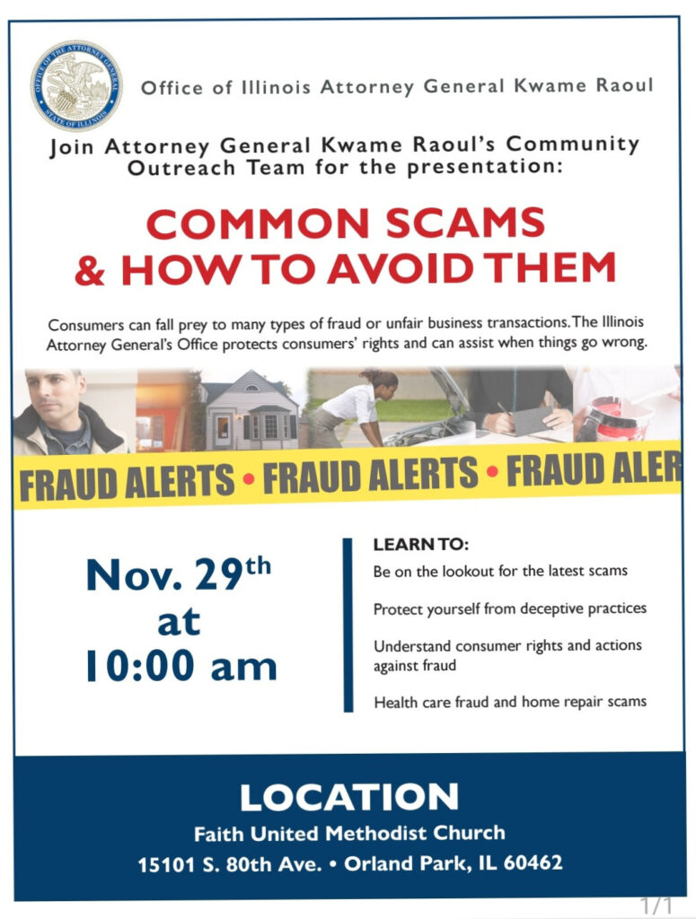 Join us on Saturday, November 29th at 10AM for a presentation from Illinois Attorney General Kwame Raoul’s Community Outreach Team, Common Scams and How to Avoid Them.